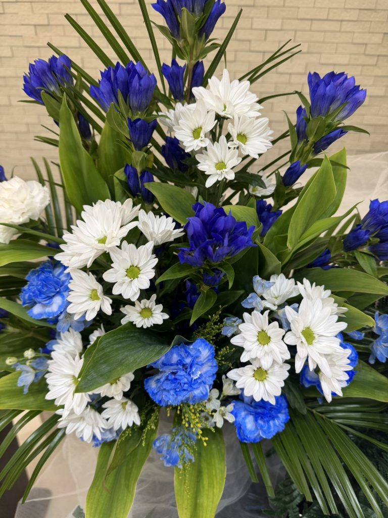 お花色は青色紫色を 基調にお選びいただきました